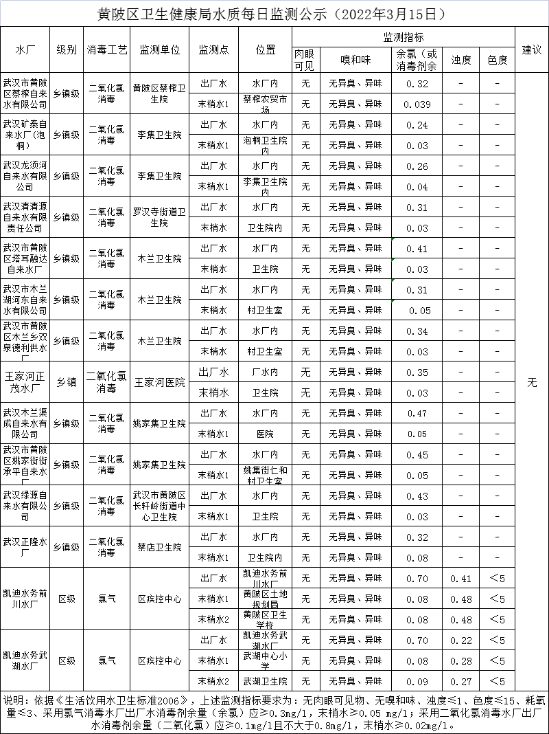 黄陂区卫生健康局水质每日监测公示(2022年3月15日)