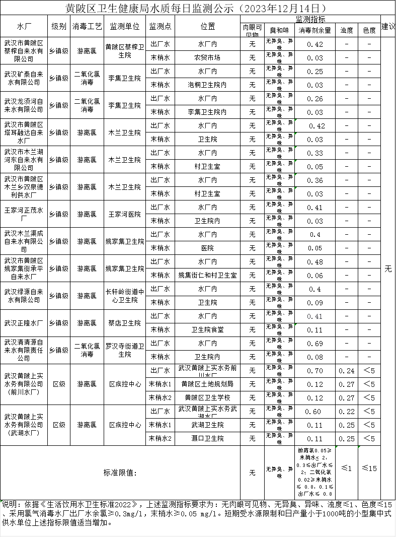 黄陂区卫生健康局水质每日监测公示(2023年12月14日)