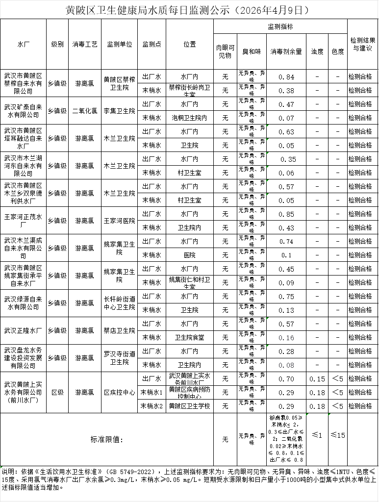 黄陂区卫生健康局水质每日监测公示(2026年4月9日)