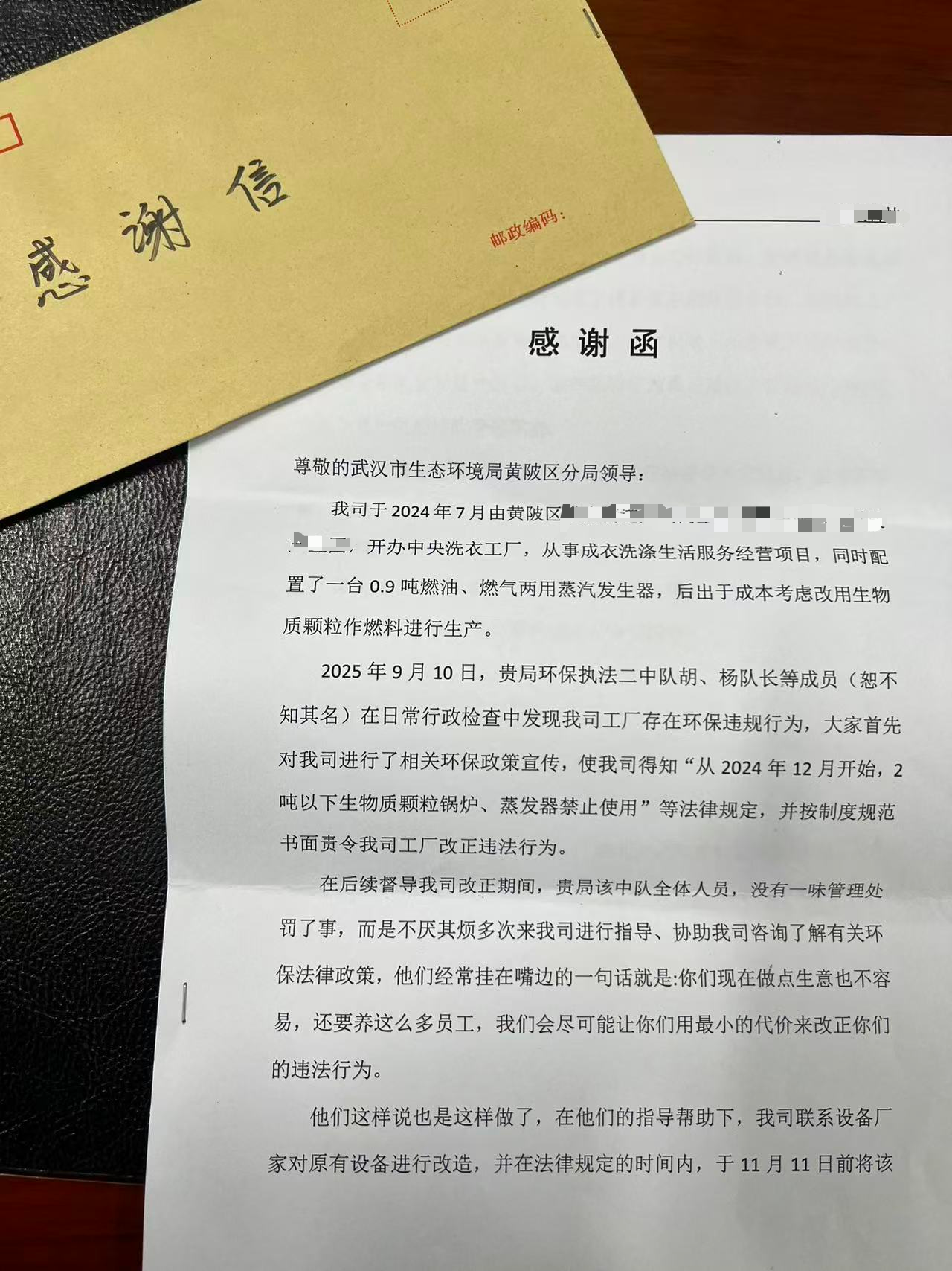 2025年12月11日,武汉市生态环境局黄陂区分局执法人员收到一面特殊的锦旗和一封感谢信,这次赠送锦旗的不是环境信访诉求得到解决的受害群众,而是此前刚被分局依法处罚的违法企业负责人王某某。锦旗上“用人性化管理执法,为经营者保驾护航”两行大字,背后是一个生动的执法有力度更有温度的基层环保故事。