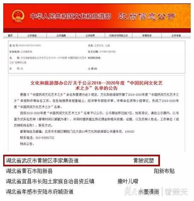 “中国民间文化艺术之乡”是1987年文化部为推动民间文化艺术事业的繁荣发展、丰富活跃基层群众文化生活而设立的一个文化品牌项目。截至2018年,中国民间文化艺术之乡共有964个。根据《“中国民间文化艺术之乡”命名和管理办法》规定,文化和旅游部开展了2018-2020年度“中国民间文化艺术之乡”申报和评审命名工作。在各地推荐申报基础上,经评审专家组评审、评审命名领导小组审议,2018-2020年度“中国民间文化艺术之乡”名单于1月9日正式公示。湖北有7个入选,其中武汉市黄陂区李家集街道凭借黄陂泥塑入选。