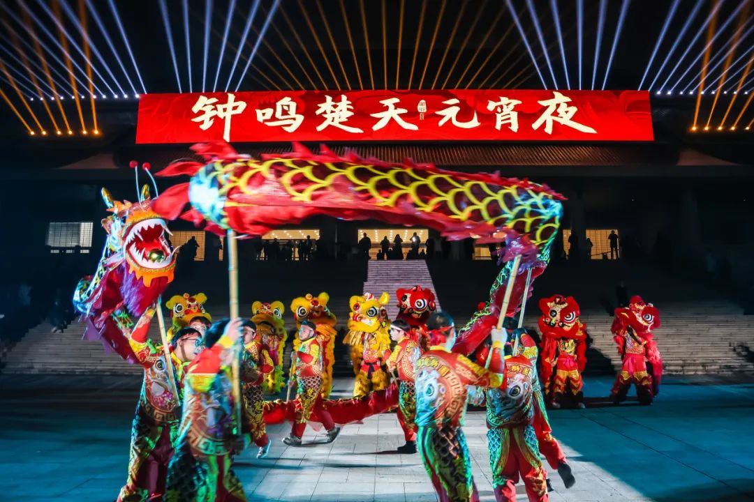 赏花灯、猜灯谜、听戏曲、放花灯,尝荆楚非遗美食,看各式湖北民俗表演,上手体验非遗技艺,现场游客乐在其中。在钟鸣楚天元宵夜现场,游客可赏灯、可赶集、可游艺、可研学、可看展,“龙迎凤舞”、“龙腾市集”、“龙凤呈祥”、“龙游阆苑”、“龙灯送客”五大版块纷繁多彩的项目为传统节日赋予了诸多科技与网红元素,既古朴典雅,又时尚好玩。游人们纷至沓来,一派盛世同欢、全城大热闹的祥和景象。