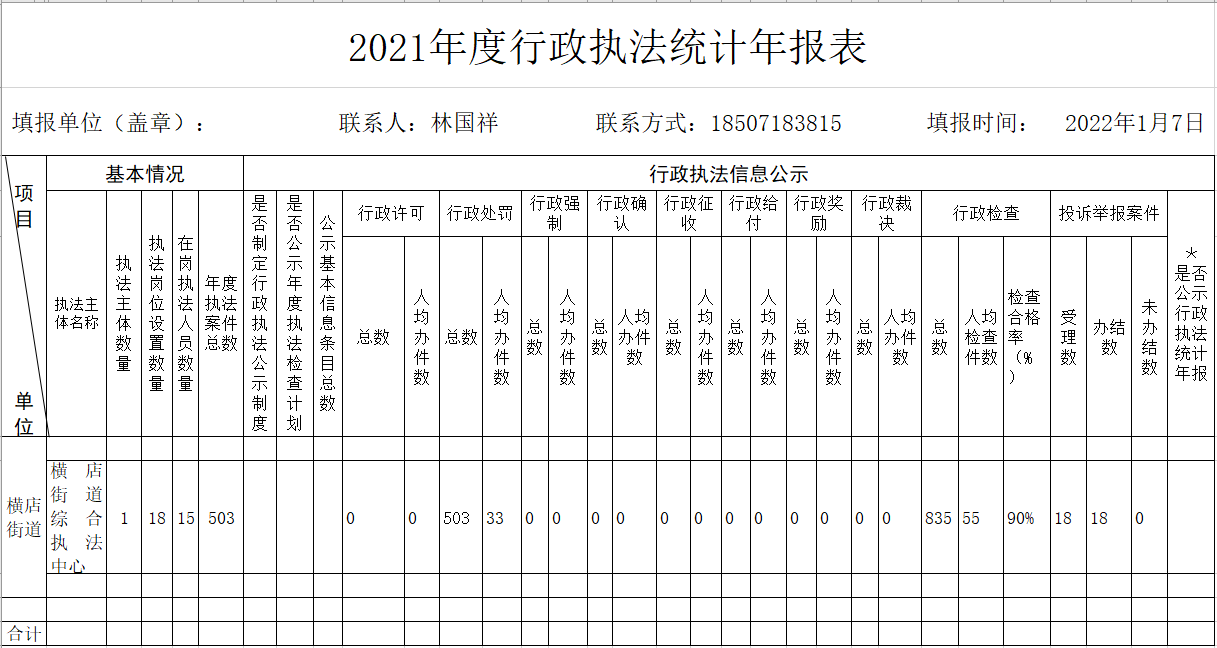 2021年度黄陂区横店街行政执法统计年报表
