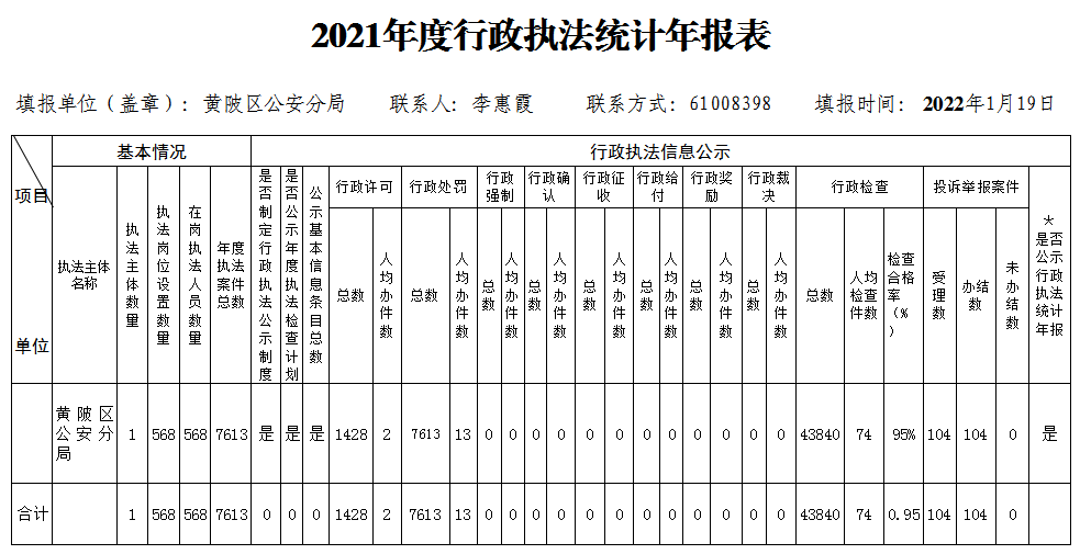 2021年度黄陂区公安分局行政执法统计年报表
