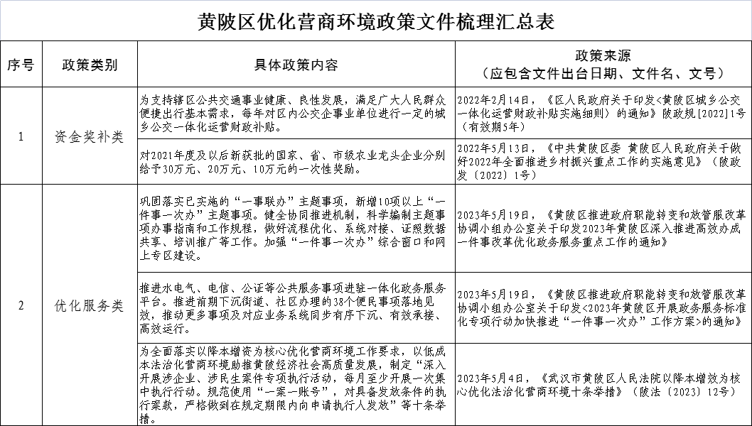 黄陂区优化营商环境政策文件梳理汇总表