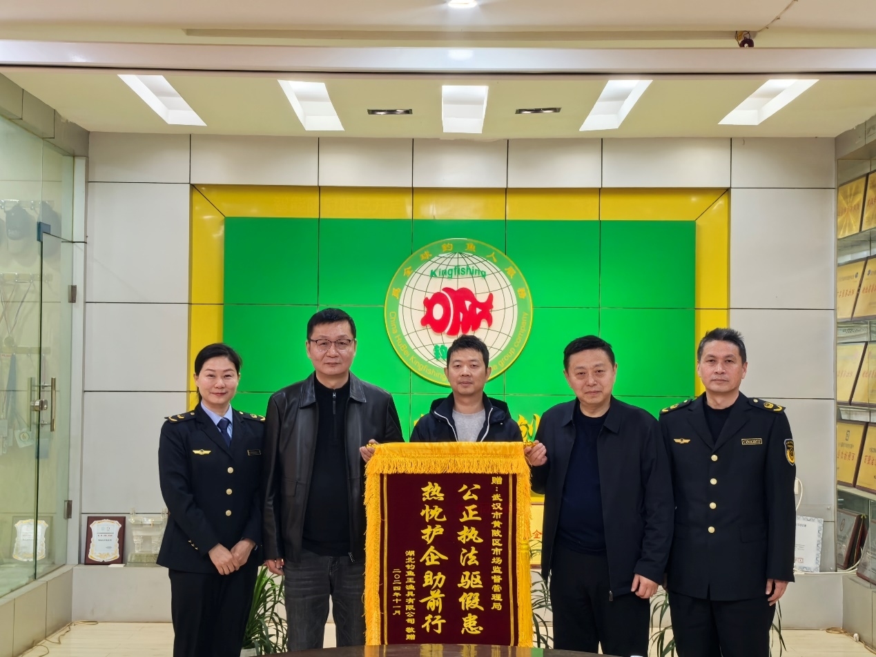 黄陂区市场监管局在接到企业的求助后,迅速响应,多科室协同作战,一场知识产权保卫战就此拉开帷幕。黄陂区市场监管局局消保科、网监科、执法稽查科、法规科和刘集市场监管所、联合介入,经过严谨的调查和专业的法律分析,认定侵权行为违反《商标法》和《反不正当竞争法》,属于典型的“傍名牌”不正当竞争行为。黄陂区市场监管局不仅指导企业完善维权证据链,还积极协调上级部门和侵权地市场监管部门,形成跨区域执法合力。通过一系列扎实有效的维权举措,推动司法维权进程,最终促使侵权方公司对湖北钓鱼王渔具有限公司作出赔偿,同时安徽当地市场监管局也对侵权企业进行了从重处罚。钓鱼王公司为表感激,向黄陂市场监管局赠送“公正执法驱假患,热忱护企助前行”锦旗。