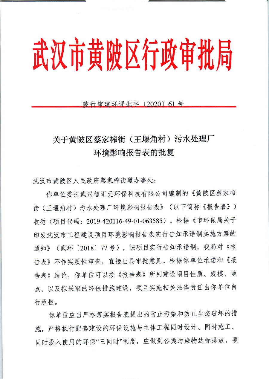 关于黄陂区蔡家榨街(王堰角村)污水处理厂环境影响报告表的批复
