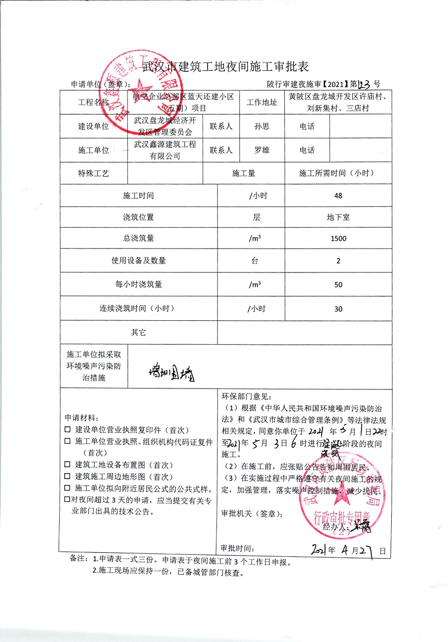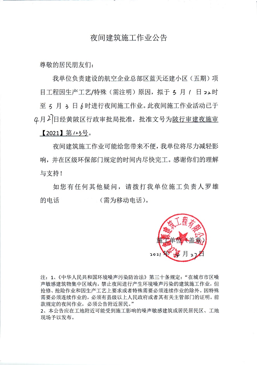 航空企业总部区蓝天还建小区(五期)项目夜间施工审批公示