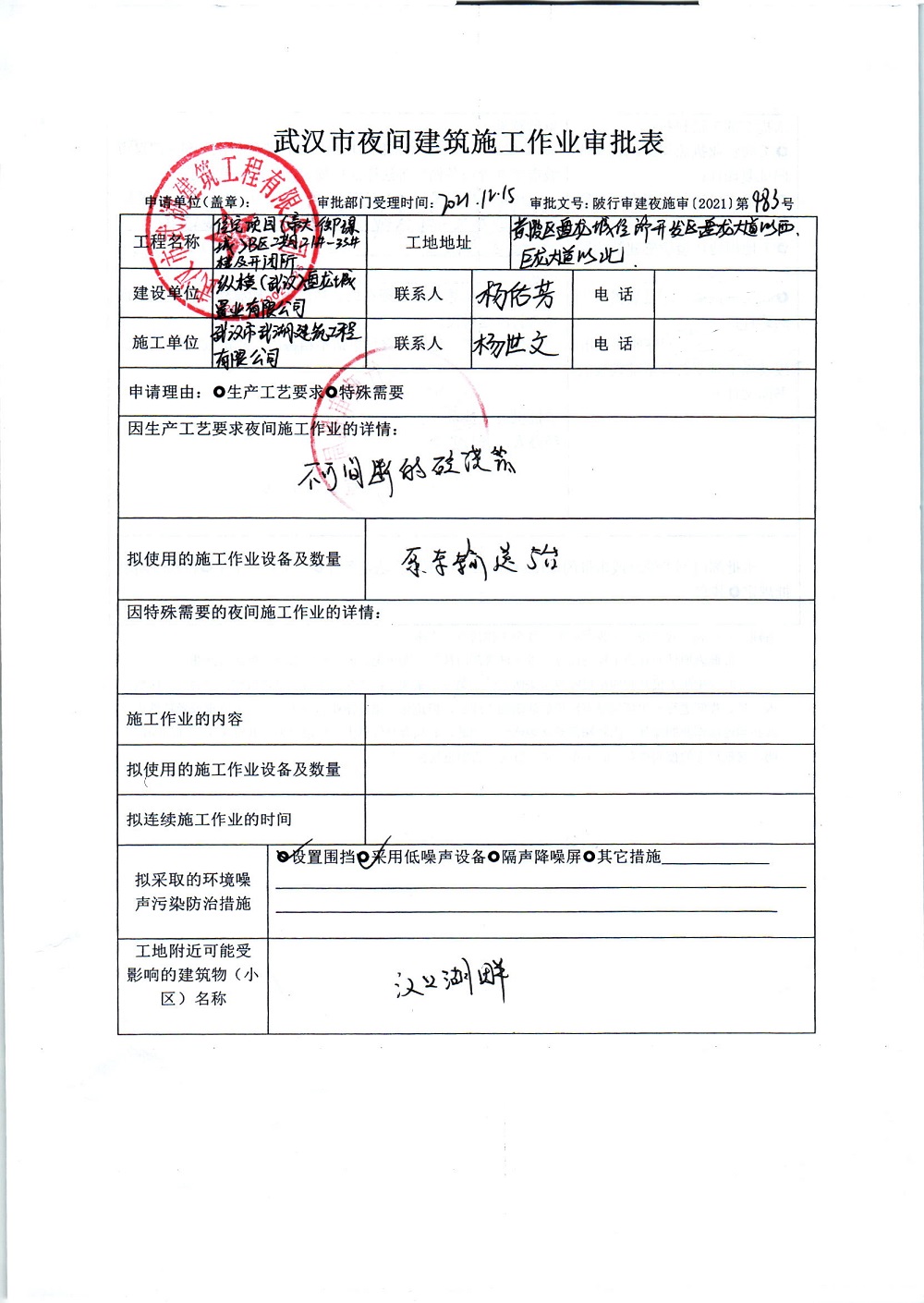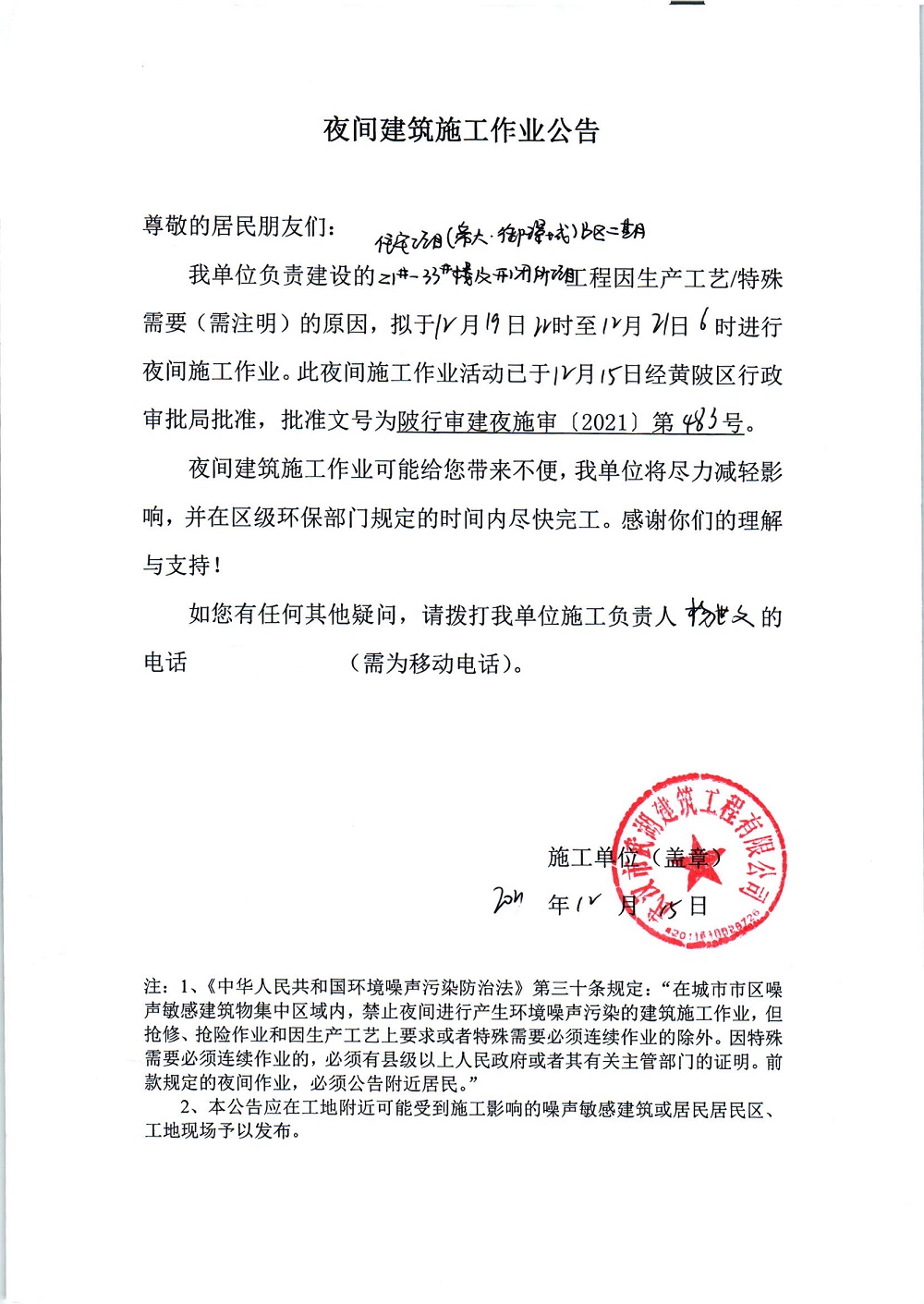 住宅项目(帝大·御璟城)B区二期 21#-33#楼及开闭所项目夜间施工审批公示