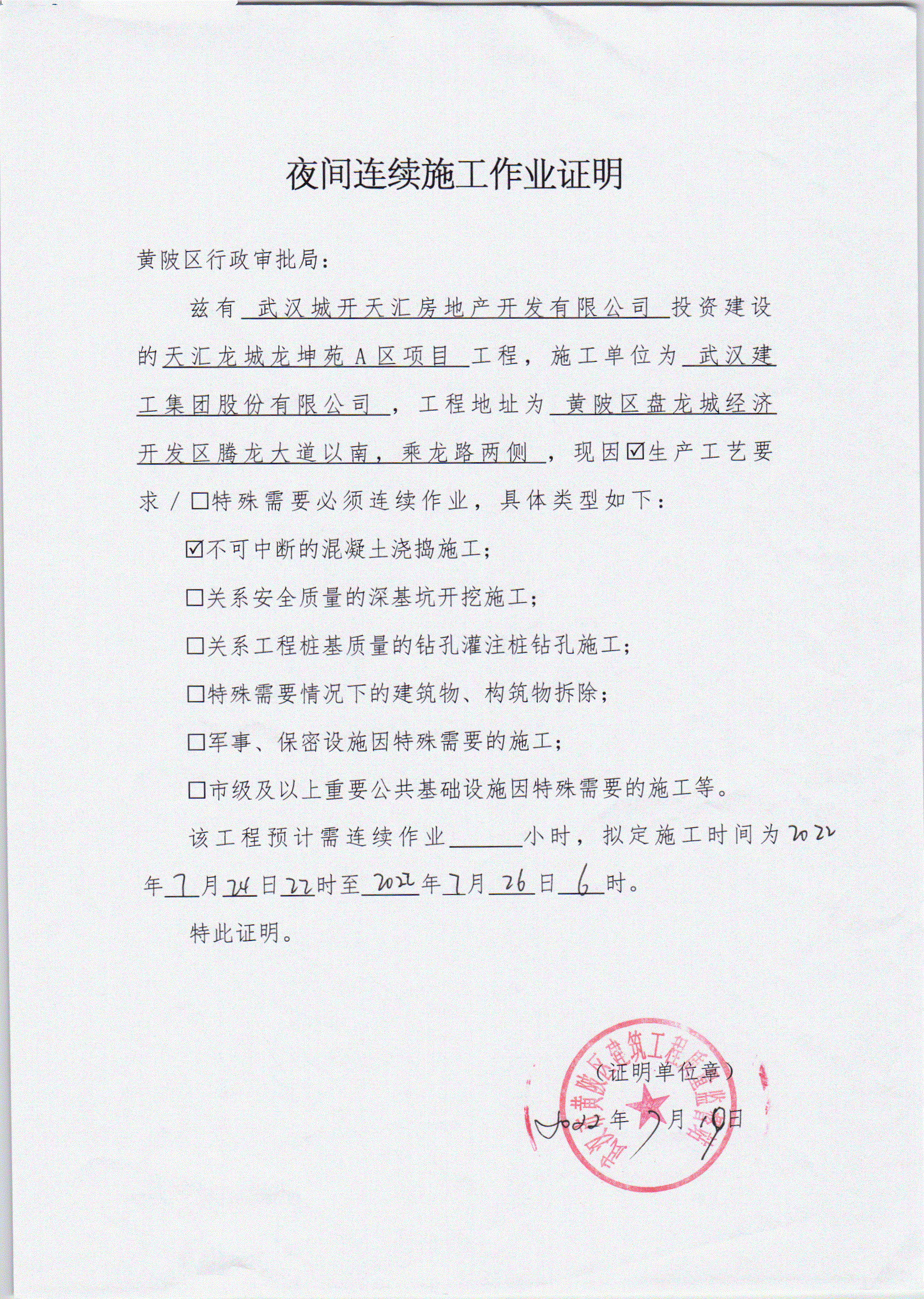 天汇龙城龙坤苑A区项目夜间施工审批公示