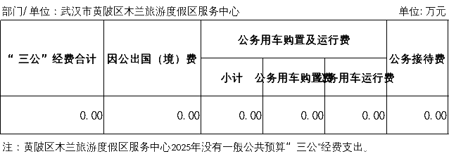 黄陂区木兰旅游度假区服务中心2025年没有安排一般公共预算“三公”经费支出,比2024年增加(减少)0万元。
