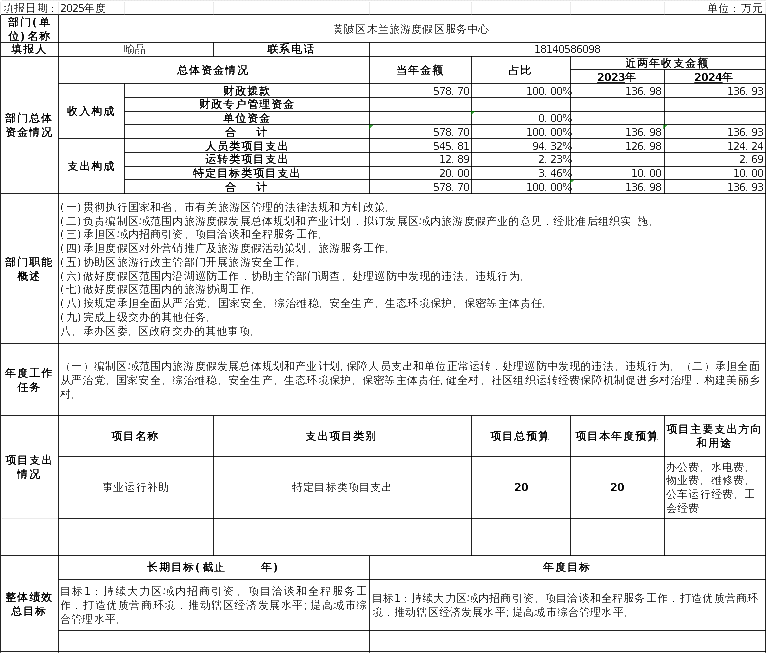 事业运行补助20万元,主要用于木兰旅游度假区服务中心维持日常运行和维护管理经费。