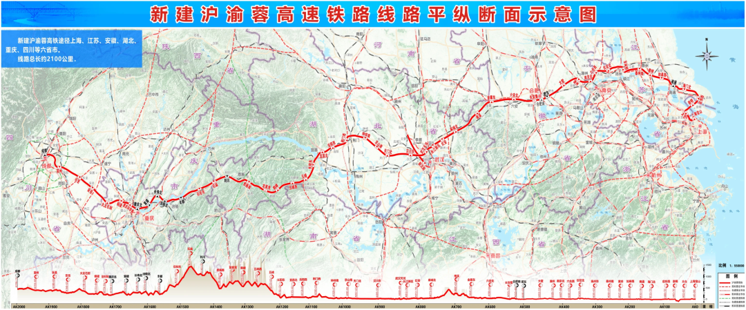 沿江高铁(新建沪渝蓉高速铁路)是长江流域综合立体交通体系的主骨干、全国“八纵八横”高铁网的主动脉,途经上海、江苏、安徽、湖北、重庆、四川六省市,全长约2100公里,设计速度350km/h,总投资约5930亿元。