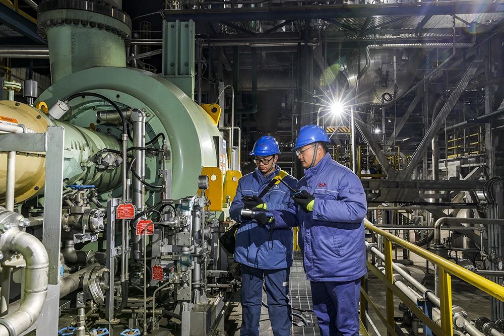 2月18日,中韩石化聚烯烃二部工作人员正在对装置关键设备进行定时检测,确保装置安、稳、长、满、优运行。中韩石化是华中地区最大的炼油化工生产基地,1月销售汽油18万吨,同比和环比都增加了2.7万吨,创历史新高。