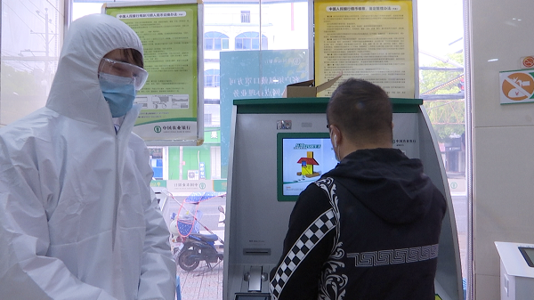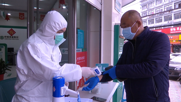 在农业银行武汉环城支行,测温台、客户身份信息登记、身体消毒等各项防控措施也都一一落实到位。