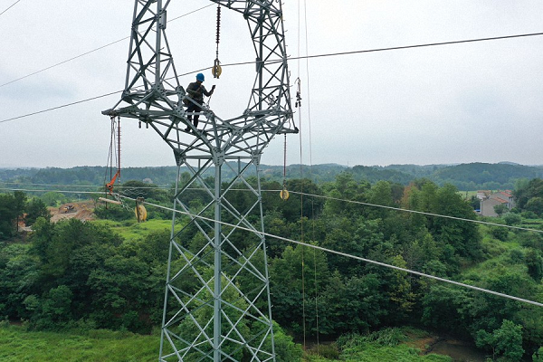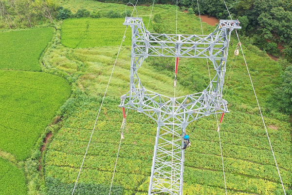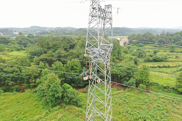 刚闯过一难关,马上他们面临的又是另一难关。“安全带、个人保安线已绑扎完毕。可以开始工作。”8月14日上午8时40分,一名施工监护人监护施工人员开始登铁塔。接近50米高的铁塔,只在底下看看都有摇摇欲坠的感觉。可施工人员以专业的技能素养,稳健攀爬在铁塔之上。烈日直直照在他们身上,没有任何遮蔽的地方,冒着酷暑在45米的高空进行着高压线路架接。他们一会挂在线路上处理连接点,一会穿梭于铁塔横梁上牵引导线,仿佛是高空“走钢丝”的杂技表演艺术家,殊不知他们只是众多供电人中的一员,正以专业的技能与为人民服务的责任担当,为建成风电场上网传输线路“铤而走险”,保证工程进度按预期送电投运。