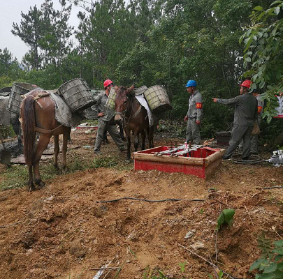 该项目位于崎岖难行的山上,道路险阻,货车根本无法通行。重达几吨的高压架空绝缘线及其他电力设备只能采用最传统的方式,依靠骡马与人扛肩担一点一点分批运上山。“大家注意脚下,小心不要踩到松动滑石,每一步都要踩稳了!”8月12日,黄陂区供电公司施工负责人一遍遍地给架空线电力设备搬运队强调一定要注意山路安全。“大家注意控制骡马行走方向,山路陡峭,千万注意不要滑落山崖!”这一路上除了队员间彼此的鼓劲,不断萦绕耳边的便是“安全”两字。40度的高温,一路的艰难,是那份让人们用上清洁能源的信念,支撑着他们抵达施工现场。