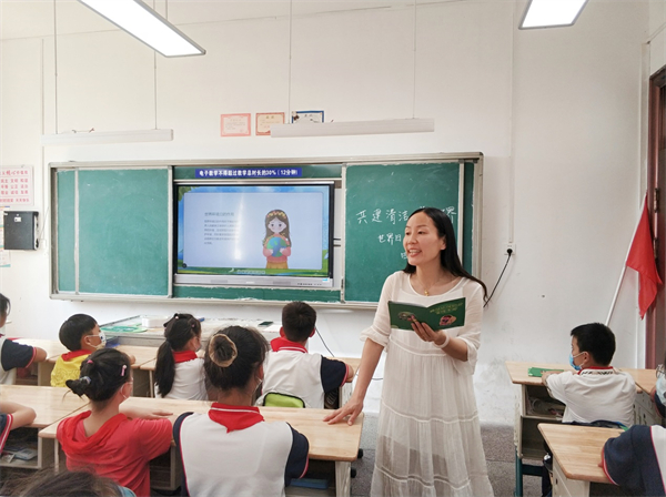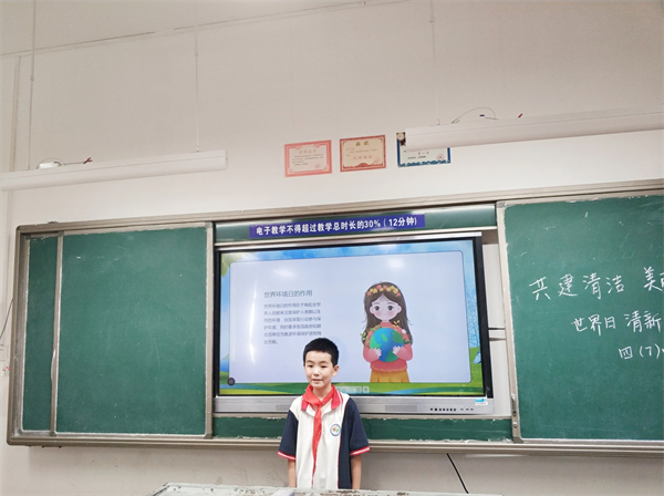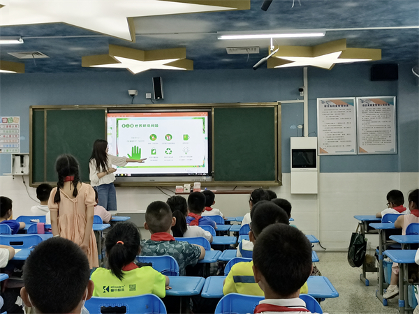 “今天晨会课内容主要是介绍世界环境日的来历,我们为什么上这一课?因为中国是全球生态文明建设中的重要参与者、贡献者、引领者”。省优秀少先队辅导员、市教师学科带头人胡凯老师介绍,“我们前川五小是区级绿色学校,有责任有义务从孩子们的环境意识抓起,培养良好的生态环境保护习惯。现在是晨会课时间,学校58个班级的学生正在学习环保知识”。