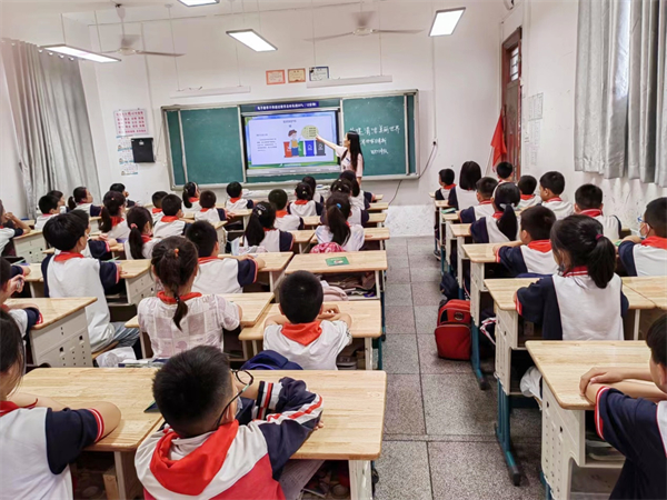 在四(7)班教室,王曼老师正运用生动幽默的语言,引导孩子们思考生活中哪些是环境污染行为。在老师的启发式提问下,孩子们开动脑筋认真思考,争先恐后回答问题,不时举手和老师互动,课堂氛围十分活跃。讲课的同时,王曼老师通过播放视频和动画,带领学生们了解生物多样性减少对自然生态环境和人类居住环境产生的巨大危害。
