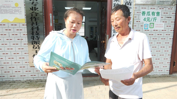 “种子催芽前需要先晾晒2天,再用温水浸种、消毒”,在黄陂区农厚蔬菜种苗专业合作社蔬菜大棚里,梅兰芝正在查看香瓜的生长情况,为合作社负责人朱农厚讲解作物种植管理的注意事项和电商平台的销售技巧。