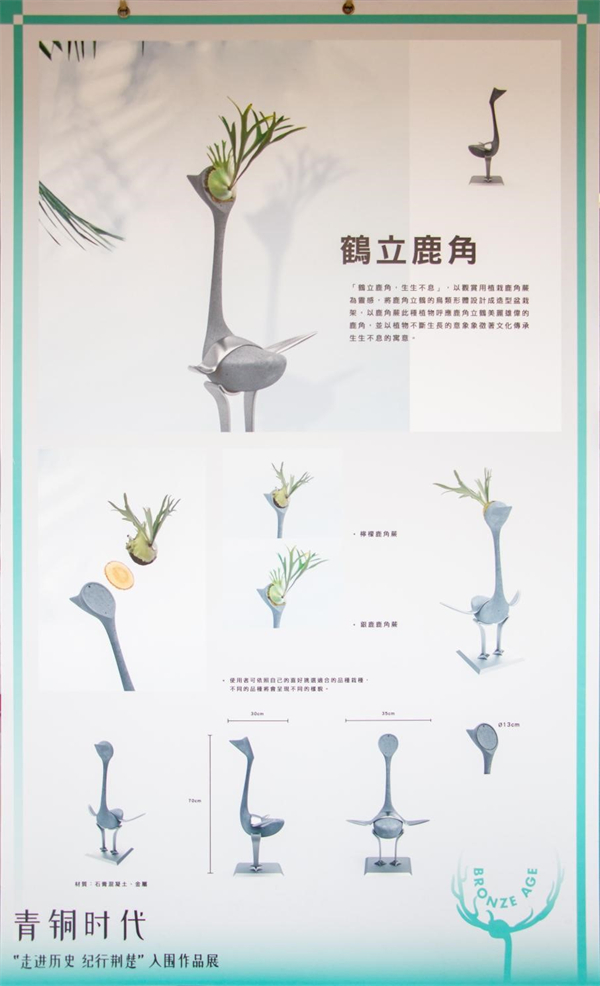 据悉,第二届“走进历史 纪行荆楚”海峡两岸文博创意设计大赛由湖北省台办、湖北省文旅厅、武汉市台办、武汉市文旅局、黄陂区台办、黄陂区文旅局共同主办,海峡两岸考古教学交流基地、湖北省文物考古研究院、湖北省博物馆、盘龙城遗址博物院协办。大赛以“青铜时代”为主题,选取湖北省博物馆和盘龙城遗址博物院的6件极具代表性的青铜文物“铜鹿角立鹤、立鸟兽面纹铜罍、曽仲斿父壶、青铜大圆鼎、绿松石镶金饰件、铜帯鋬觚形器”为设计素材与蓝本,面向海峡两岸的所有高校师生及关心、热爱历史文化,有志于从事文物IP文创产品设计开发的个人和单位征集作品。大赛采取“线上举办+线下展览及颁奖”的形式,通过多维度开展作品征集、组织两岸历史、设计、文博类专家开展线上研学讲座、特邀两岸“行业大咖”担任评委等,引发两岸广泛关注。大赛共收到来自两岸近1900份作品,经过严格评审,最终有56份作品入围决赛。