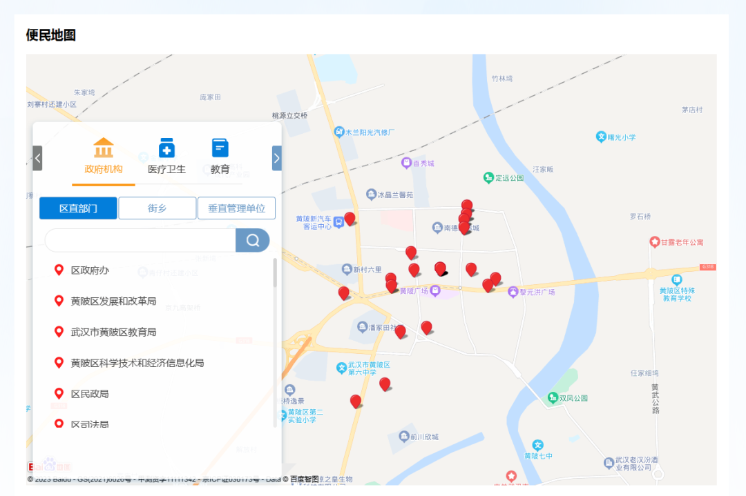 “政务服务”栏目中新增的“便民地图”功能,通过整合资源,增加政府机构、医疗卫生和教育场所等有热度、有温度的栏目,将政府机构及各场所共160个点位的地址、联系方式等相关信息在数字地图中标注展示,并提供地图导航功能让用户一键直达,极大地提高办事、出行效率,为用户提供更加快捷、优质、高效的政务服务。