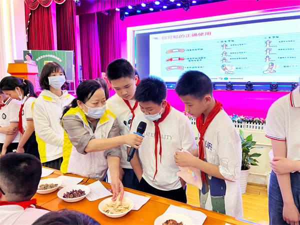 黄陂区中医医院药剂科的药师们将20余味中药材、20余种中药标本、中药加工工具、中药香囊摆放至区实验小学学术报告厅中,在每一味药材及标本旁都附上了文字介绍,药师们逐一为大家讲解陈列的中药的名称、功能主治,孩子们通过看一看、闻一闻、摸一摸,进一步加深了对中药材的认识。药师们还用通俗易懂的语言向同学们讲解了生活中常见的中草药,让同学们善于发现身边的中草药。在药材一旁展示出的中药香囊及中药加工工具成了颇受欢迎的“明星”,同学们对这次的“认识中药之旅”充满了新奇感。