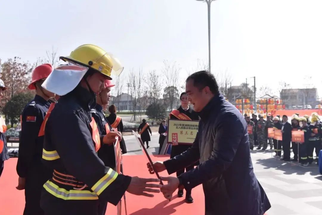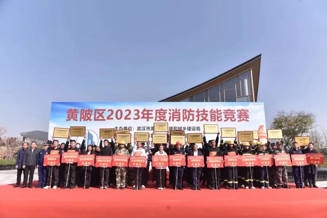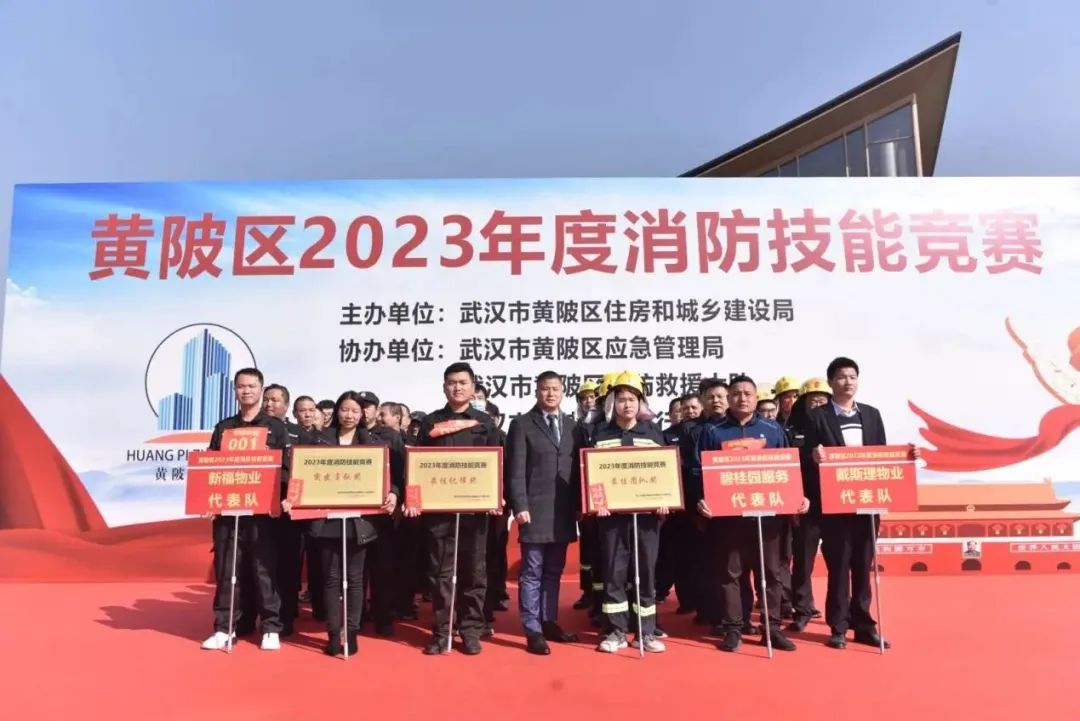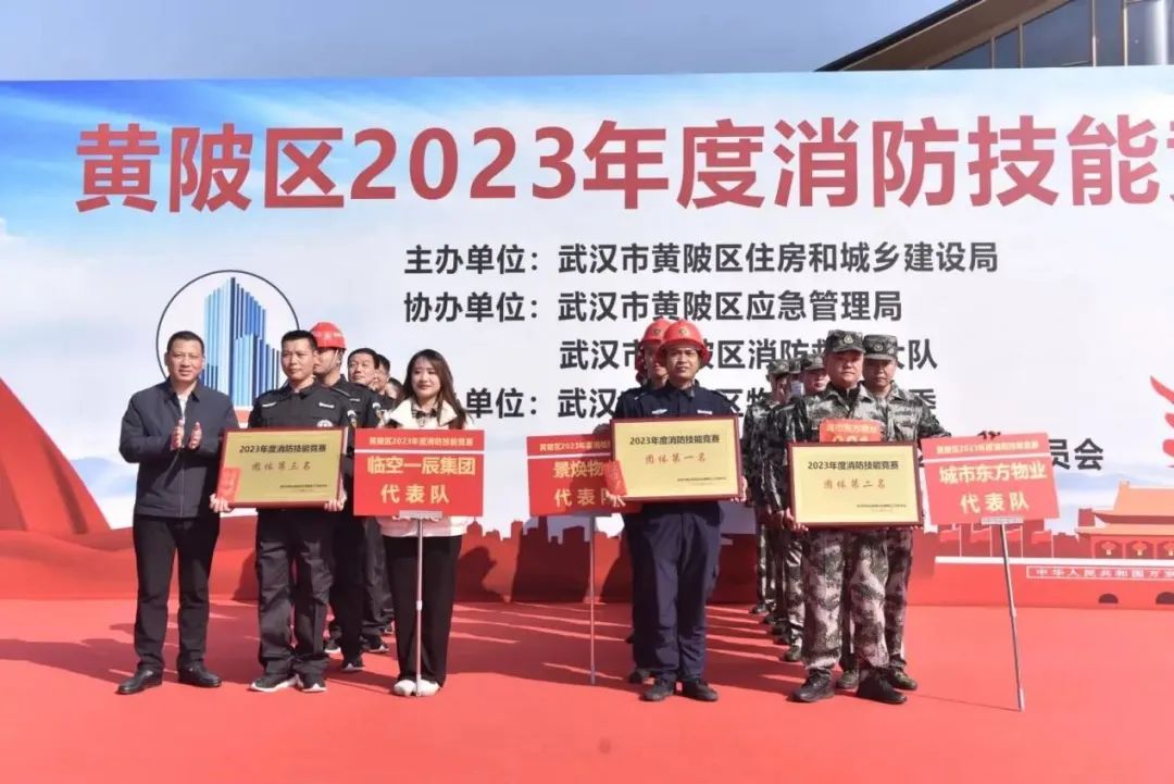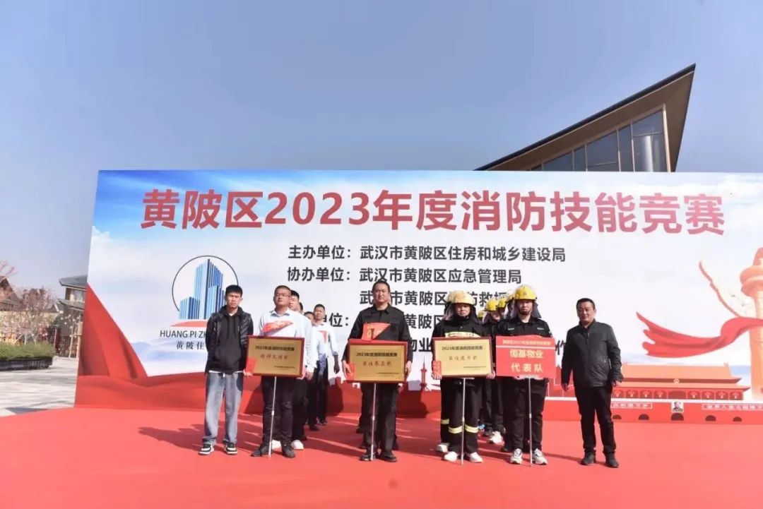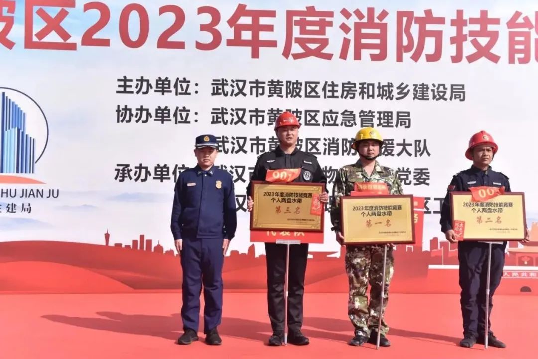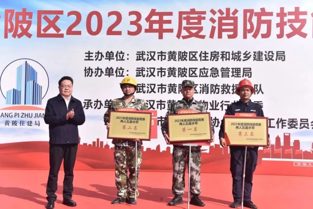 荣获两人五盘水带项目一等奖获奖者是武汉城市东方物业有限公司天汇龙城分公司、二等奖是武汉瑞泰智慧服务有限公司、三等奖获奖队是景焕(武汉)物业管理有限公司。由黄陂区应急管理局局长罗剑波为获奖者颁奖。