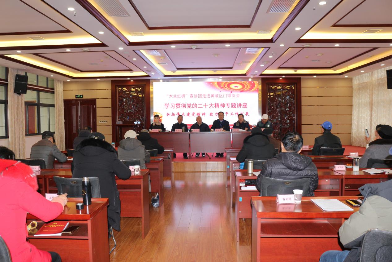 为深入学习贯彻习近平新时代中国特色社会主义思想和党的二十大精神,认真落实中共中央《党史学习教育工作条例》,2月21日,黄陂区老干部“木兰红枫”宣讲团走进区门球协会,开展学习贯彻党的二十大精神专题讲座,开启新春第一讲。区委组织部副部长、老干部局局长王志超发表动员讲话,区委老干部局副局长郑庆竹主持会议,区委老干部局一级调研员熊克彪,“木兰红枫”宣讲团团长胡炳基,区离休干部、原黄陂县人大常委会副主任孙文太出席活动。区门球协会常务理事会全体成员和监事成员参加。
