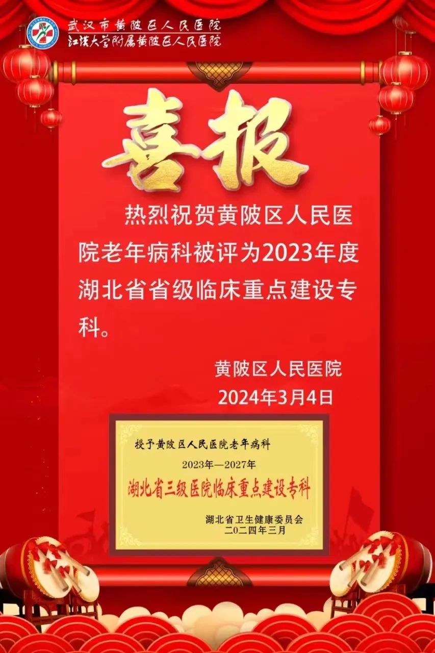 黄陂区人民医院老年病科被评为2023年度湖北省省级临床重点建设专科。医院将以此为契机再接再厉,坚持创新驱动,继续健全和完善重点专科建设,加大科研投入力度、深化人才队伍建设、强化质量内涵建设。同时,充分发挥临床重点专科的引领带动作用,发挥医院特色优势,提升医疗健康服务能力,为患者提供更加优质、高效的医疗服务,为高质量建设区域医疗中心作出积极贡献。