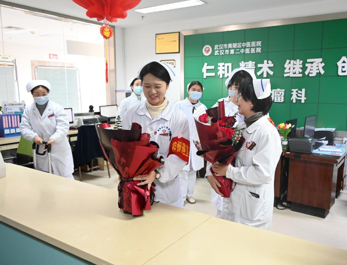 三月春意浓,风和百花鲜。3月8日上午,在第114个“三八”国际妇女节来临之际,黄陂区中医医院院长彭朝安带领院领导班子成员和院工会、护理部、门诊办等职能科室负责人到各科室、新区分院为医院女性职工送上最美的鲜花和节日的问候。