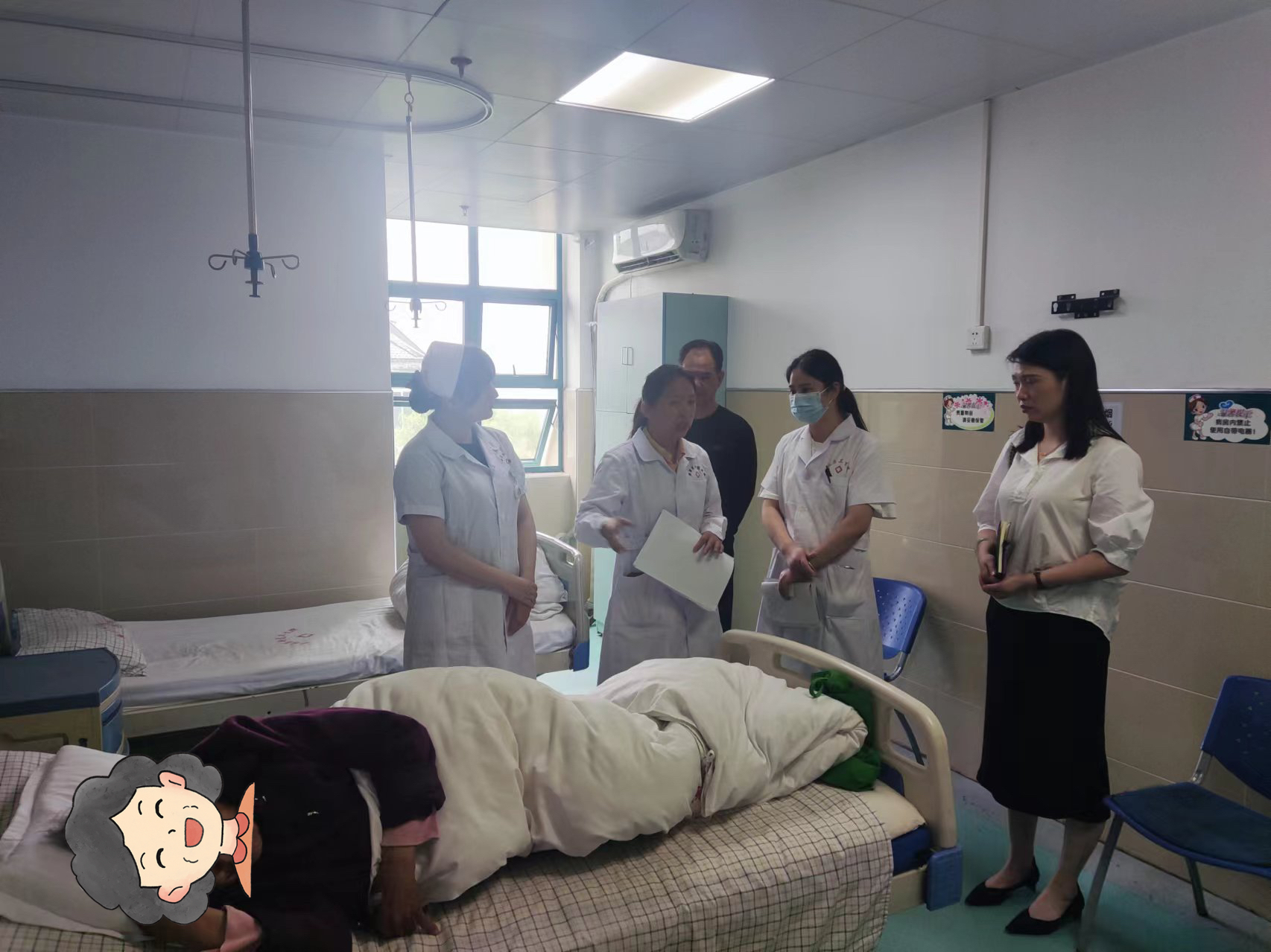 首先,毛珊华、杜亚蕾一行首先来到卫生院各护理单元,查看病房环境和护理工作开展情况,结合基层医疗卫生机构临床护理特点进行指导,并对现有住院病历的护理文书书写情况进行了抽查和点评。