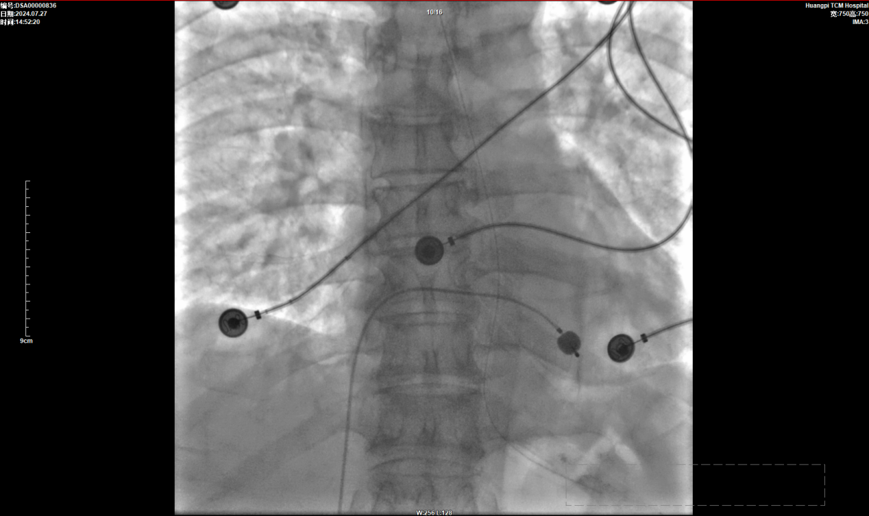 经与家属充分交代病情取得同意后,在心血管病科团队和介入室团队的共同努力下,在介入导管室内成功为患者植入了心脏临时起搏器。术后心电图示心室起搏节律,心率50次/分,患者术中、术后无任何不良反应,待患者生命体征平稳后即返回原病房继续行术后相关治疗。