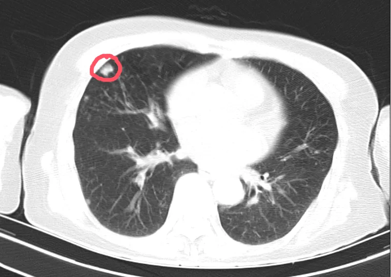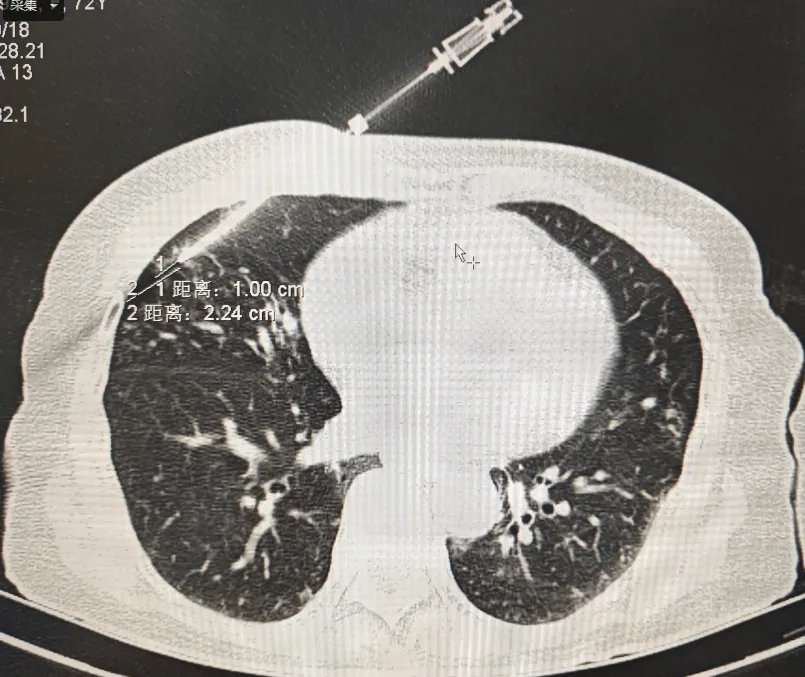 72岁的余婆婆因发现右肺中叶有实性结节,就诊于黄陂区中医医院肺病科(呼吸内科),复查胸部增强CT提示余婆婆肺结节靠近胸部外侧,结合结节大小已达12mm,科室团队在全面评估和深入讨论后,决定为患者实施经皮肺穿刺活检术,进一步明确结节性质,为后续治疗提供科学依据。