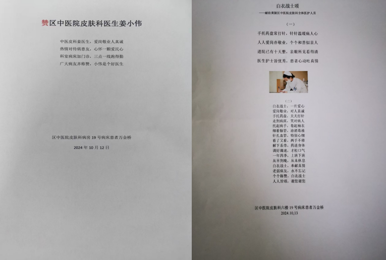 在医护患的共同努力下,患者病情逐渐好转,红疹慢慢消退,瘙痒明显减轻,睡眠质量也得到了显著改善。万爹爹被皮肤科医护人员的真情对待和高效治疗感动,特地作诗几首以表达谢意。