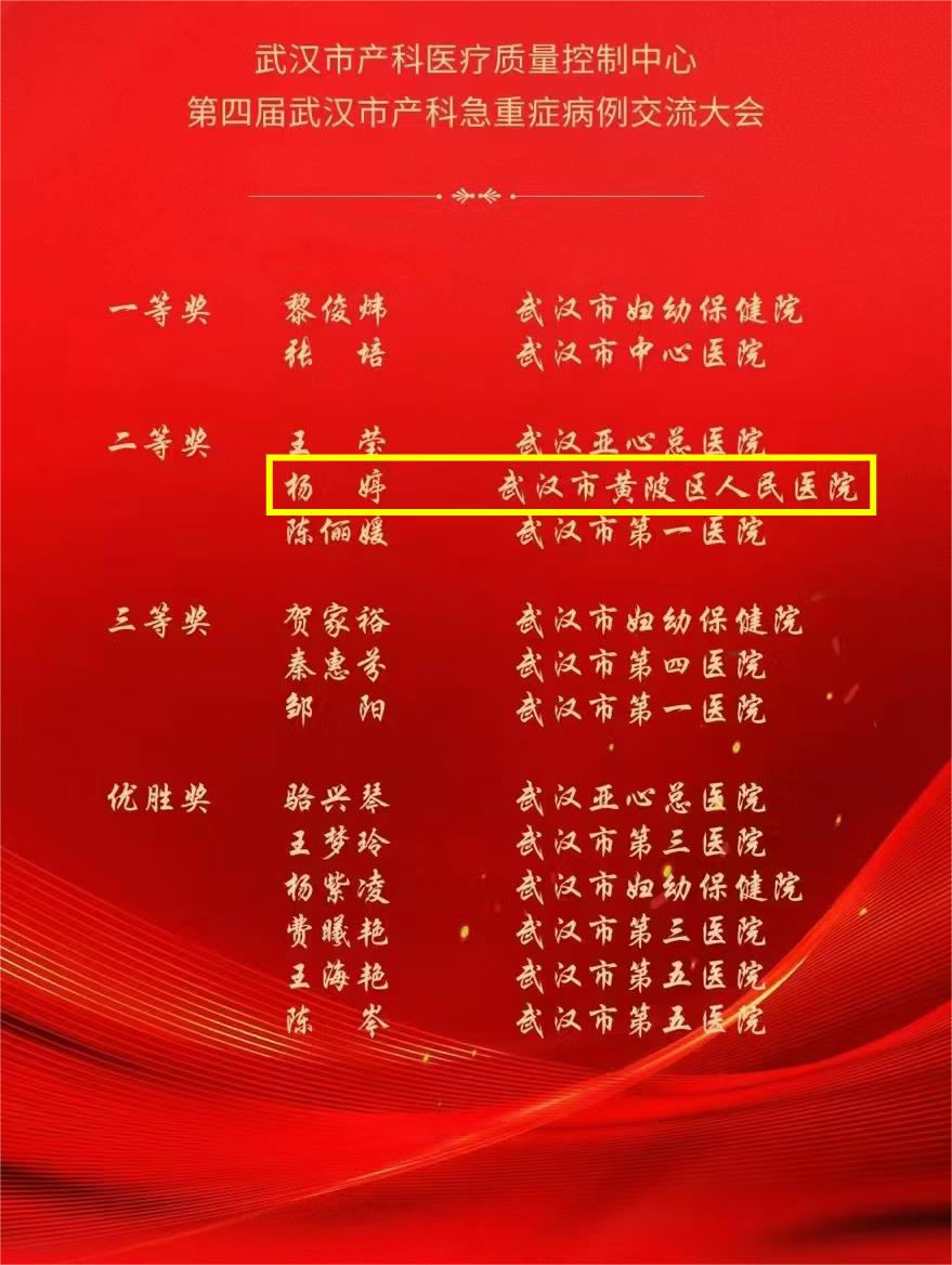 11月15日,武汉市第四届产科急重症病例交流大会在武汉市中心医院落幕,众多产科医学领域专家学者云集,探讨产科医学领域最新进展及未来趋势。黄陂区人民医院妇科医生杨婷做“一例车祸后复合伤合并胎盘早剥”危重孕产妇病例分享,并荣获二等奖!