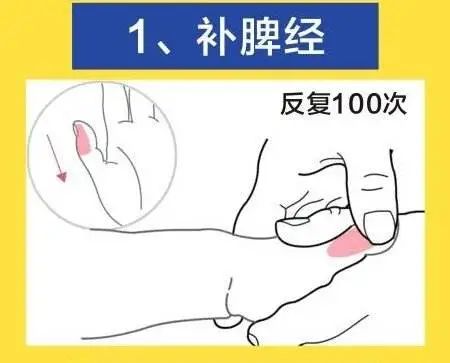 补脾经:沿拇指桡侧缘,从指尖向指根方向推按,每次操作3—5分钟,或推揉100~500次,可健运脾胃、促进消化吸收。