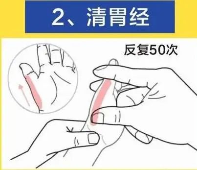 清胃经:用拇指指腹从腕横纹推向拇指指根,力量均匀柔和,次数100—500次。