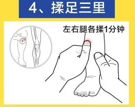 揉足三里:位于小腿外侧,犊鼻下3寸,胫骨前嵴1横指处。按揉50~150次,可以调理脾胃、强壮身体、提高免疫力。