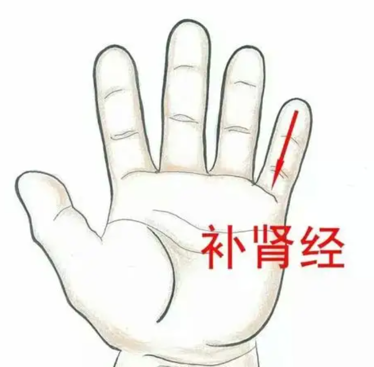补肾经:沿小指掌侧从指尖向指根方向推按,每次3—5分钟,或推揉100~300次,可滋肾益脑、强壮筋骨。