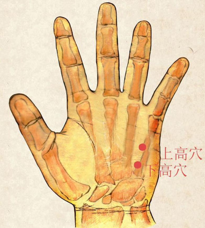 揉增高穴:包括上高穴和下高穴,分别位于手掌第四、第五掌骨之间处,掌横纹掌侧上不同距离处。按揉1~3分钟,可促进疏经调气、理脾和胃,同时具有促进脑神经皮质素分泌的作用。