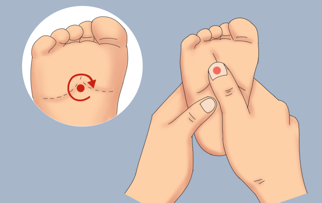 按揉涌泉:涌泉穴位于足掌心前1/3与后2/3交界处的凹陷中。每日一次,每次按揉3—5分钟或100下,可强身健体、养心安神。