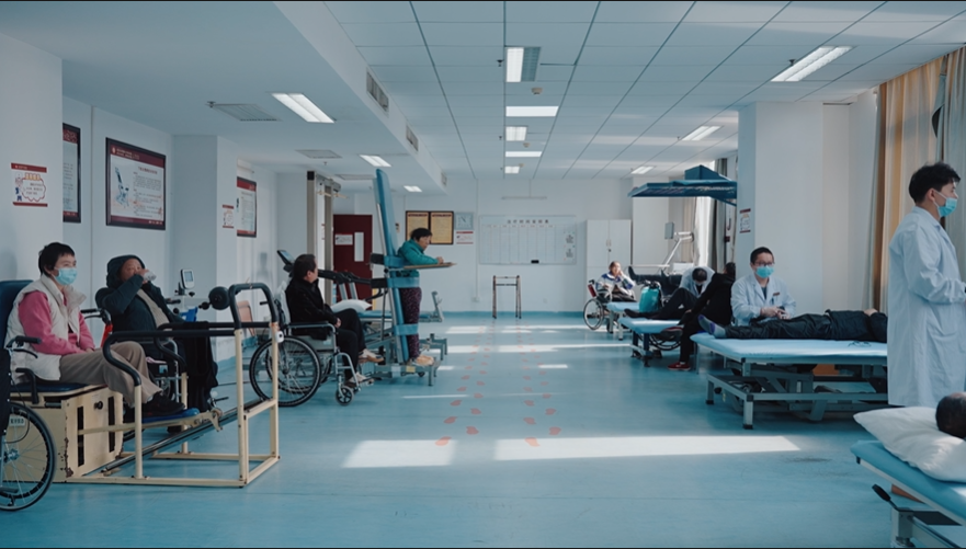 在康复科运动大厅,十几位患者在康复师指导下,配合各类器械进行着康复治疗,他们虽然活动能力受限,但认真配合康复师努力进行康复训练,脸上洋溢着对生活的希望。