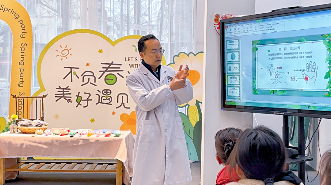 活动现场,区中医医院儿科副主任彭浩以生动图文与临床案例相结合的方式,深入浅出地解析小儿“脏腑娇嫩、形气未充”的生理特点,介绍了小儿发热、积食、脾胃虚弱、鼻炎等一些常见疾病的家庭应急推拿手法。同时建议家长通过调整饮食结构、适度运动、规律作息等方式增强小儿体质。例如,针对脾胃虚弱问题,他推荐了山药、鸡肉等药食同源食材,并提醒家长避免给孩子食用生冷、油腻、不易消化的食物。