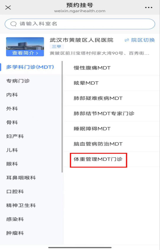 体重管理门诊:武汉市黄陂区人民医院公众号→就医服务→预约挂号→多学科门诊→体重管理MDT门诊。
