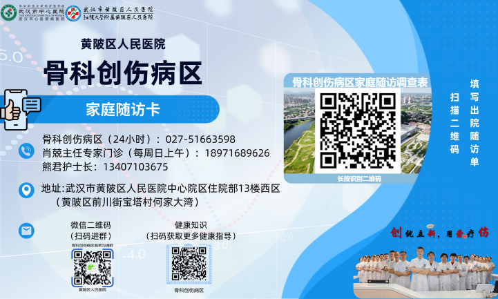 它就像一位“随叫随到”的私人医生,24小时在线待命。不管是深夜的疑惑,还是清晨的担忧,只要拨打随访卡上的电话027- 51663598,咱们骨科创伤病区的医护团队立刻化身“解忧小能手”,为你答疑解惑。要是想找专家深入聊聊,肖兢主任专家门诊每周日上午开诊,熊君护士长专业建议随时送达!