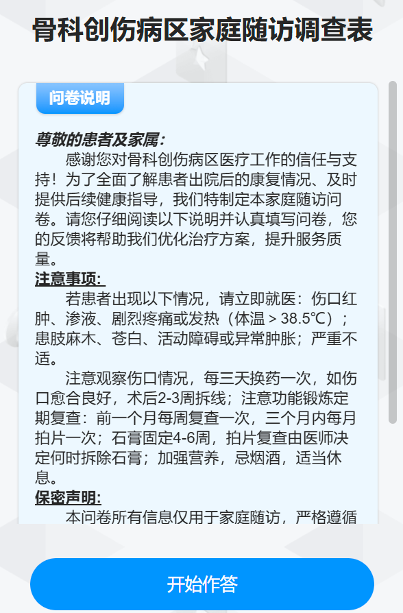 您还在为出院后的康复问题抓耳挠腮?别慌!骨科创伤病区“秘密武器”——家庭随访卡闪亮登场,一键解锁超省心康复模式,从此健康管理不再愁!
