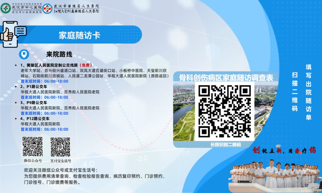 随访卡还贴心标注了来院路线,黄陂区人民医院定制公交线免费乘坐,P1、P9、P12路公交车首末班时间清晰明了。不管是第一次来院,还是后续复诊,照着卡片上的路线走,轻松找到我们,再也不用担心迷路啦!同时,随访卡还附有医院公众号和生活号,扫一扫,清单查询、病历复印、预约缴费,足不出户,帮您解决健康问题。