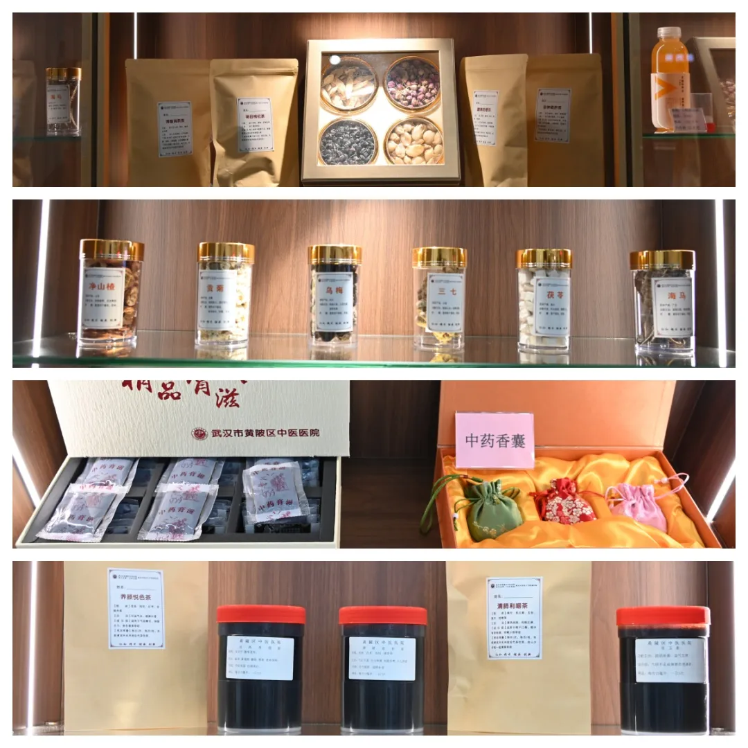 踏入黄陂区中医医院的门诊大厅,浓厚的中医药文化氛围扑面而来。一面展现“望闻问切”中医精髓的文化墙,诉说着中医传承千年的智慧。展示柜中,陈列着道地饮片、精致丸剂、中医膏滋、散发着清香的药囊,以及养生药枕等特色产品。每一味药材、每一件成品,都讲述着中医药“草木有情 护佑健康”的深厚底蕴。