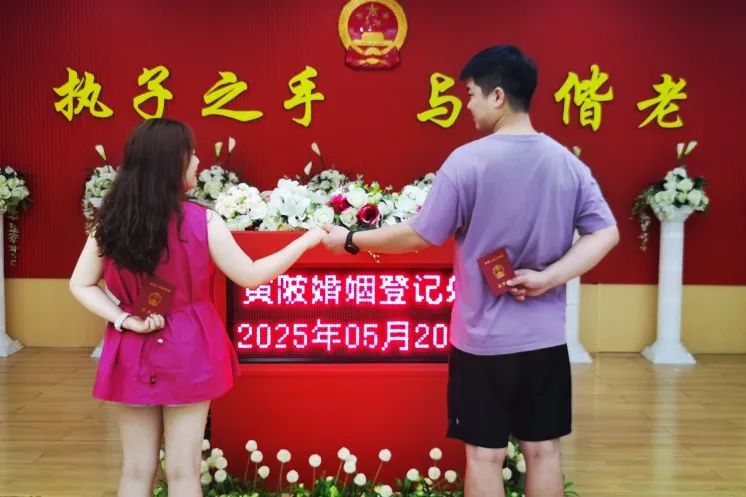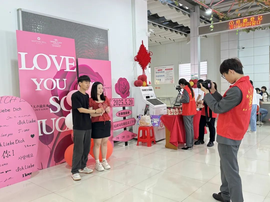 “‘2025’谐音‘爱你爱我’,又恰逢‘520’,凑在一起,代表着‘爱你爱我’。” 曾女士手持结婚证,笑容灿烂地依偎在爱人身旁,“我们俩一商量,果断选择今天领证。往后余生,愿携手同行,把日子过得红红火火!”